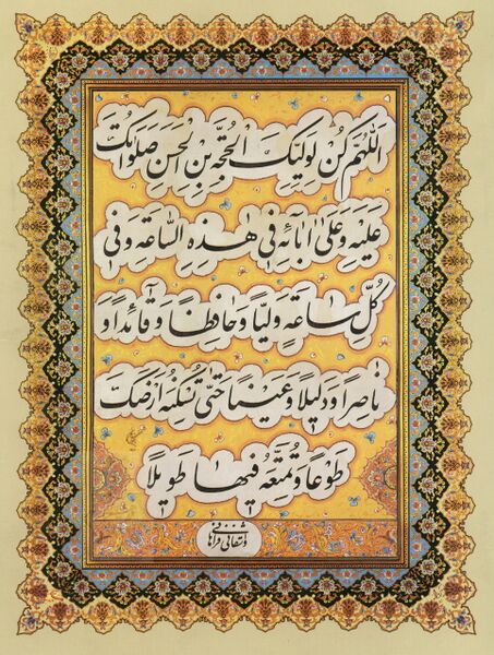 | semasa | 13:14, 22 Mac 2022 | 1,927 × 2,551 (3.14 MB) | A.ahmadi | قطعه خوشنویسی دعای اللهم کل لولیک، اثر فتحعلی واشقانی فراهانی؛ برگرفته از: http://www.mohebanemahdi313.blogfa.com/ |